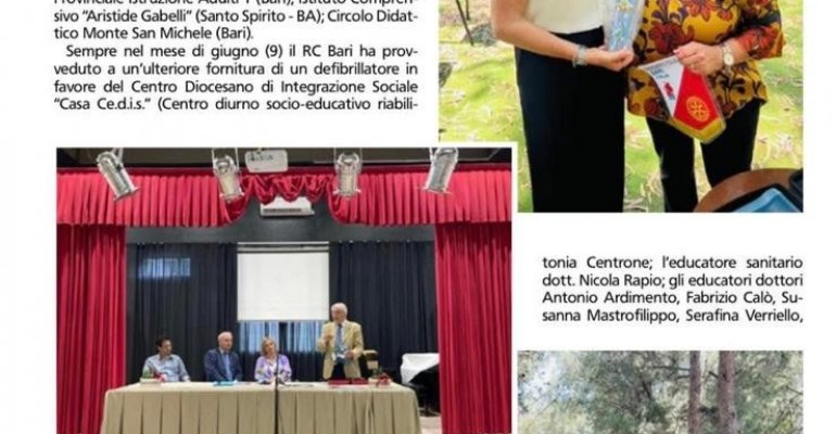Il Rotary Club Bari ha attuato nel mese di giugno (5-6- 8-9-13) l’importante Service “Far battere i cuori: fornitu- ra di cinque defibrillatori”, con il supporto del Distretto 2120, consistente nella fornitura di cinque defibrillatori a cinque scuole del territorio barese, individu...
